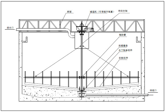 含有细粒物体的料浆或污水,经槽架或污泥管给入浓缩池的中心部位,料浆做均匀辐射状向周边缓慢流动,在温游中料浆或污水中的固体颗粒籍自重或絮凝作用而沉降。由于浓度较低,颗粒基本做自有沉降,沉速较快,继而沉入浓集带,沉速较慢。沉到下部一沉积带,也是浓度较高的压缩区,水分从沉降颗粒的间隙中不断析出。中耙架连续回转时,耙齿对该部沉积物沿池底的锥形坡面逐级推向池底的中心处,由该处的排料口排出。中耙齿推进沉积物时,也是刮板对沉积物的一个压缩过程,这也大大的促使析水作用的加强,因而从排料口排出的沉积物时经过浓缩的料浆或污泥。池上部是澄清带,澄清液从池边溢流堰排出,从而构成浓缩机工作的全过程。