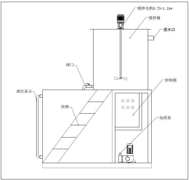 2、存药箱:用于存放已经搅拌好的溶液,供投加设备用。